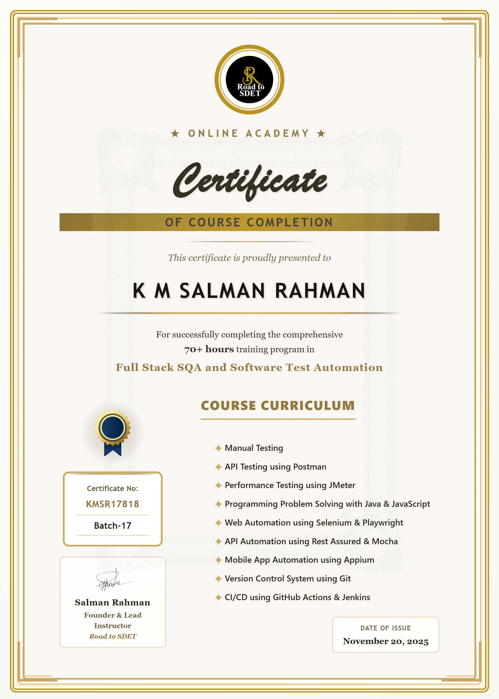 SeleniumJavaJavaScriptTestNGAppiumJUnitAPI TestingJenkinsJMeterPlaywrightMochaManual TestingGitGitHub